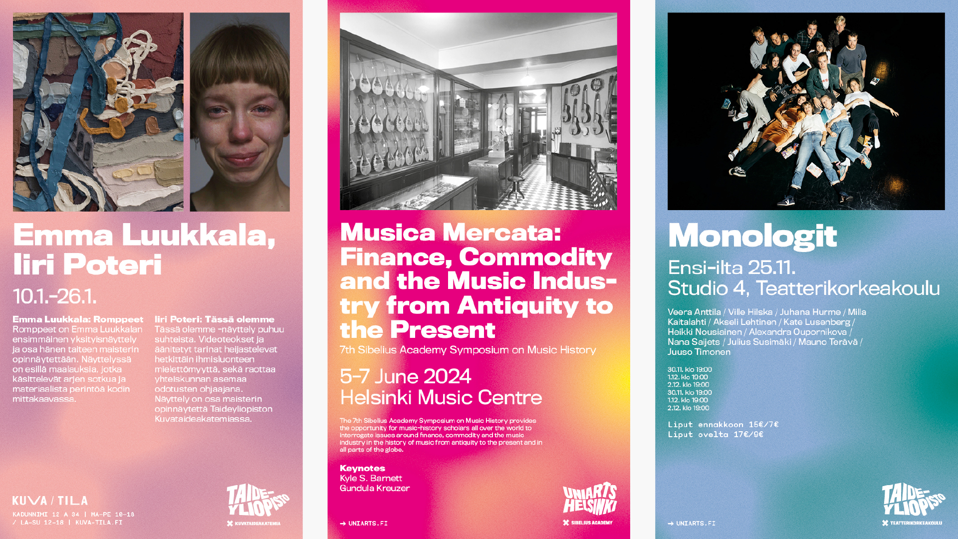 On this page, you can read about Uniarts Helsinki’s visual identity when promoting artistic and research-related events. The page presents the most common applications.